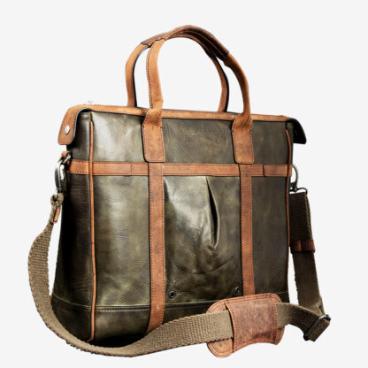 1 Front slip pocket with short handle and a long cotton webbing handle with shoulder strap.