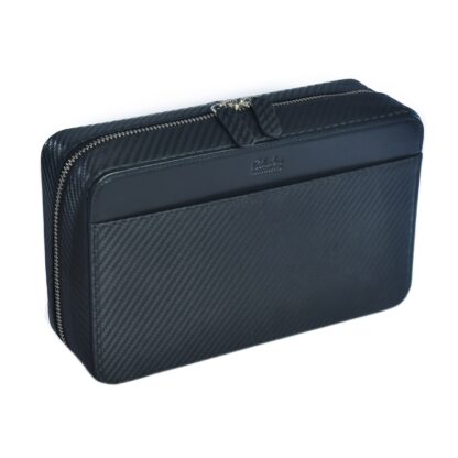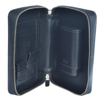 A fusion of elegance and utility, this travel organiser blends carbon fibre and soft textured leather. With a removable 4-cigar case, ample inner pockets for lighters and cutters, and even space for credit cards, it’s the perfect blend of travel convenience and style.