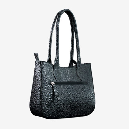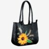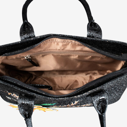 This is a genuine leather ladies shoulder bag and has one main compartment with top zip closure, front side flower applique work with hand painted design, back side zip closure, inside front one slip in pocket and phone case, inside back lining zip pocket and at bottom four studs.