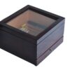 Dark walnut finish, transparent acrylic top, cedar wood lining, magnetic enclosure and an accessory storage drawer