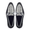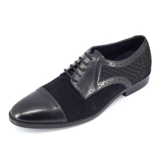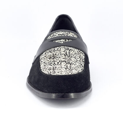 • Leather & Finish: The primary color of the suede is black, giving the shoe a sleek and versatile look. The fabric panel features a mix of white and black, creating a speckled or woven pattern.
