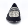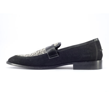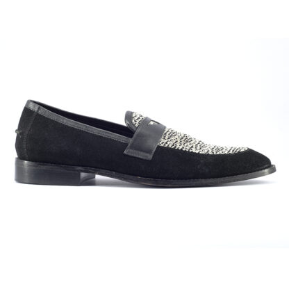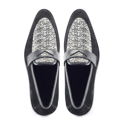 Features:• Leather Loafer Shoe: The classic Leather Loafer Shoe silhouette with the distinctive “”penny strap”” across the vamp is clearly visible. The primary material used is suede, giving the shoe a soft and textured look. The vamp features a textured fabric panel, adding a unique design element.