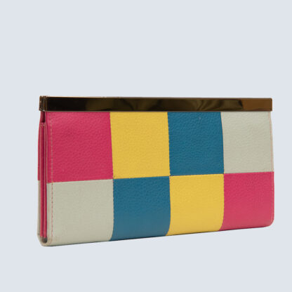 Stylish spacious ladies genuine leather multi block metal clutch with shiny nickel metal finish. It is a perfect carry for an evening. Stylish spacious little metal clutch with black metal finish . I
