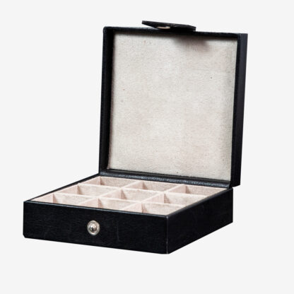 This elegant men’s cufflink box is useful in day to day life and also during official business trips. Made with genuine leather, it has 9 cufflink slots (6x pairs per slot). Keeps all the cufflinks and other small valuable jewellery items safe in one place! With 9 sections, this lidded stacker is built to hold cufflinks, rings, and other small accessories. This box is designed with a secure popper closure ideal for short holiday breaks and business trips. The perfect storage solution for the modern man.